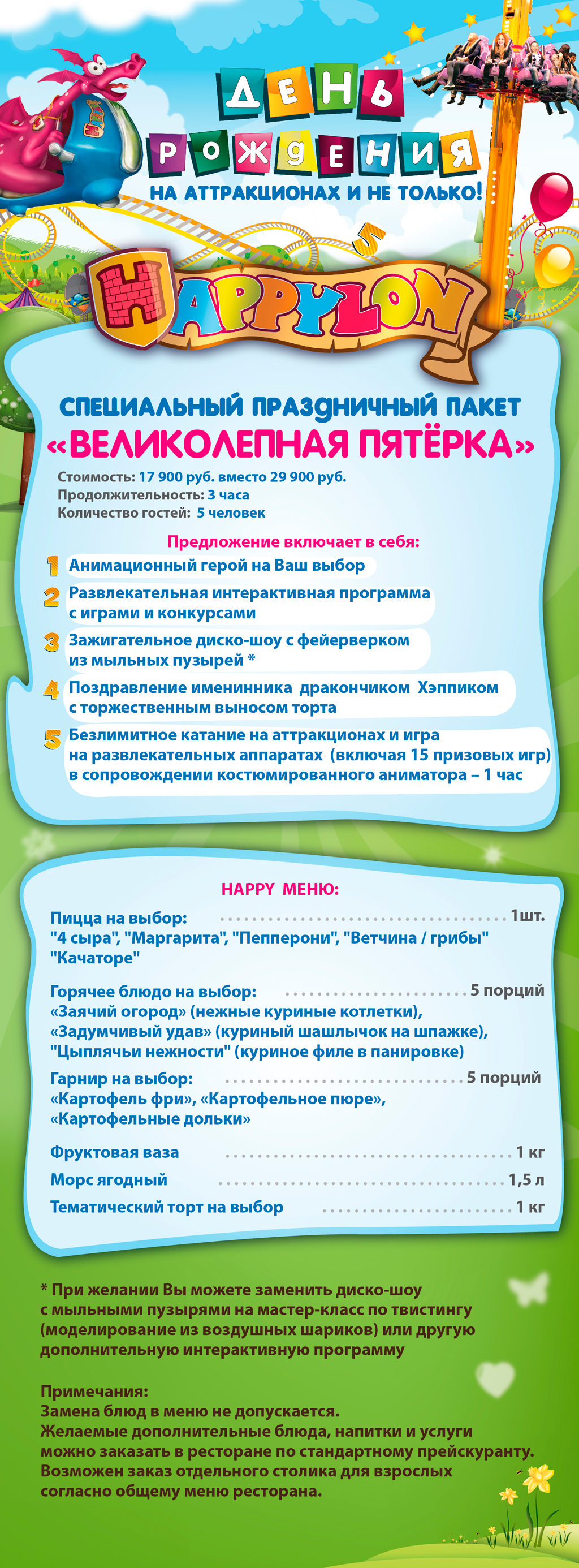 - Пакет включает в себя анимацию, тайм-карту для игры на аттракционах и развлекательных аппаратах, поздравление ростовой куклы Дракона Хэппика, меню и бронирование столика в общем зале ресторане «Таверна»